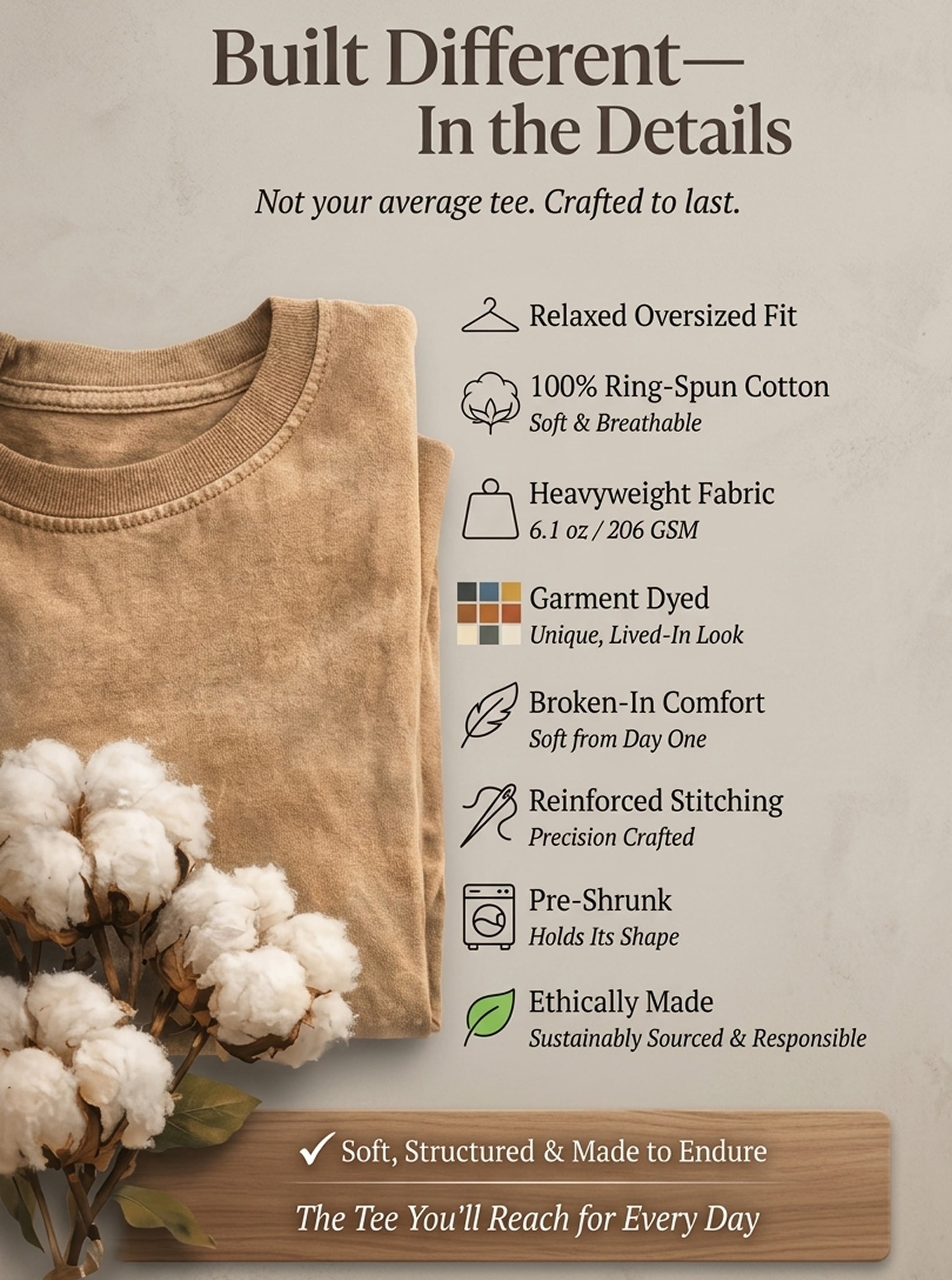 It’s made from premium heavyweight (206 GSM), garment-dyed 100% cotton that feels soft, structured, and broken-in from day one. Designed to hold its shape, resist fading, and last through repeated wear — so it becomes part of your everyday, not something you replace.