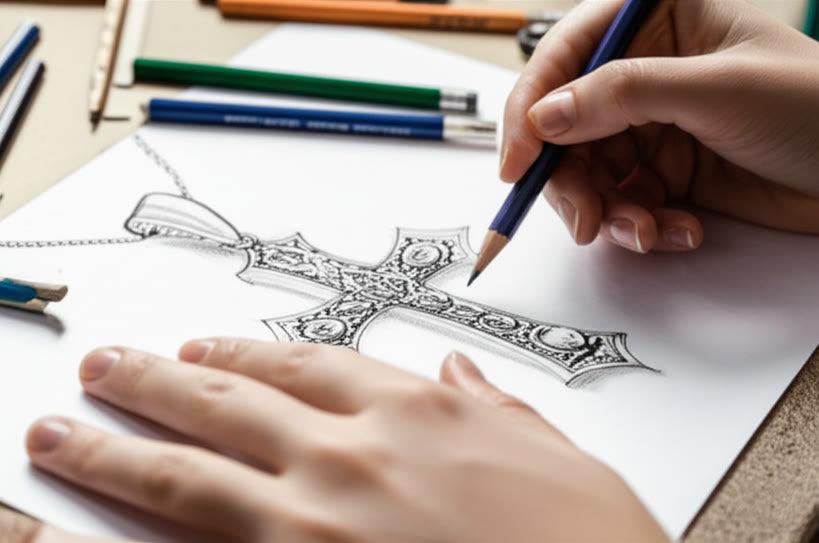 Each piece begins as a pencil sketch and is handcrafted in gold, silver, and hammered finishes—designed with care and purpose by artisans who bring scripture to life through their craft.
